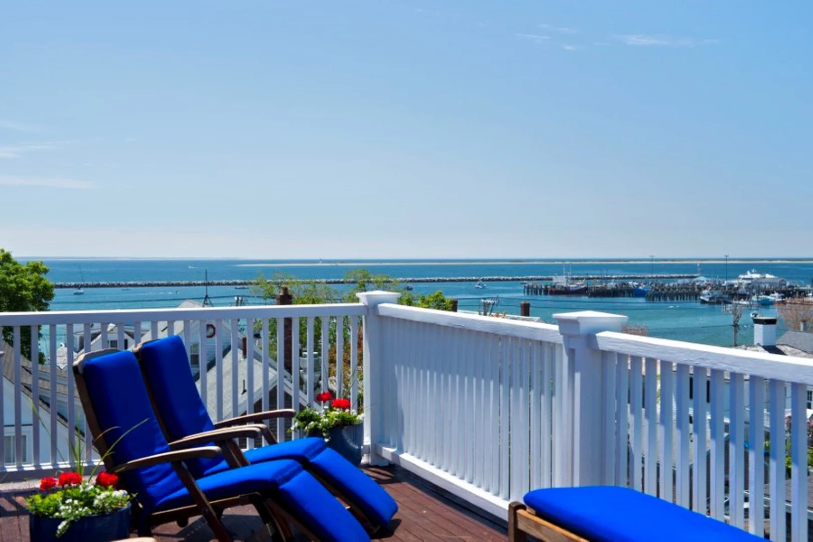 This spacious 310 sq. ft. penthouse with 180 degree views features a queen-size bed with premium W-Hotel-style mattress, a private separate sitting area, and a gas fireplace that enhances the room’s warm and inviting atmosphere in season. A microwave oven and private nespresso coffee maker adds convenience for longer stays, while the modern tiled bathroom includes a generous walk-in shower with a rain-head shower. Additional amenities include a flat-screen full-HD Smart TV, complimentary WiFi, and USB charging stations. A semi-private deck furnished with loungers, tables, and chairs offers truly stunning water views overlooking the town and harbor, creating an exceptional space to relax and take in Provincetown’s changing light.